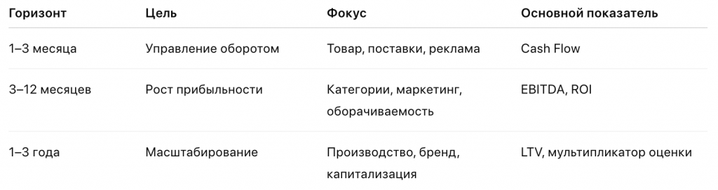 - Бизнес с выручкой от 3 млн ₽ в месяц — горизонт 1–3 года. В игру вступают инвестиции, создание бренда, диверсификация поставщиков и выход на новые площадки.