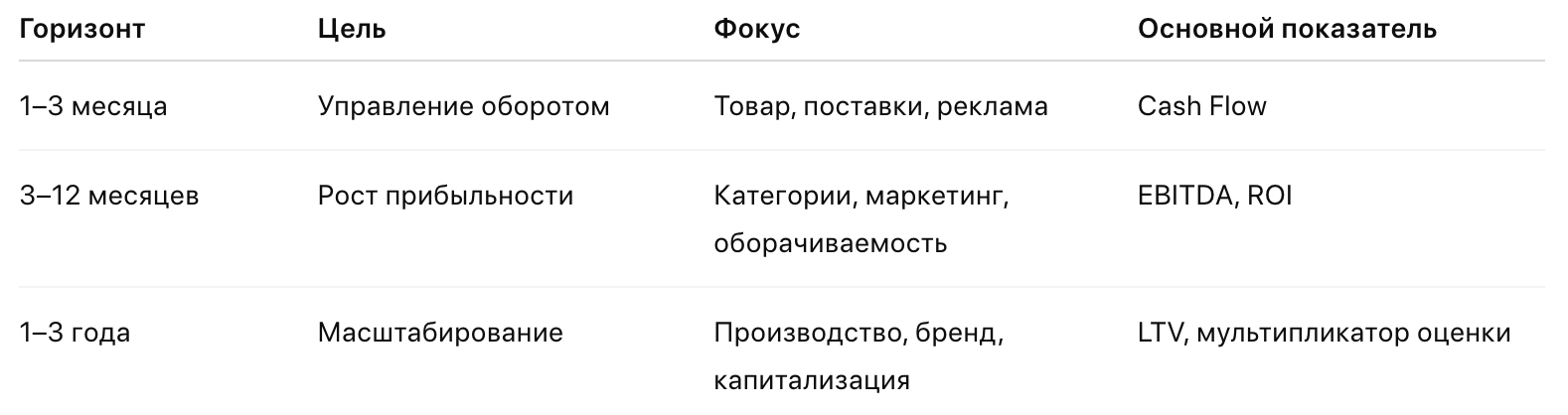 Чтобы не «захлебнуться» в цифрах, используйте принцип 3 горизонтов — метод, применяемый в стратегическом менеджменте крупных компаний.