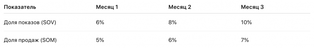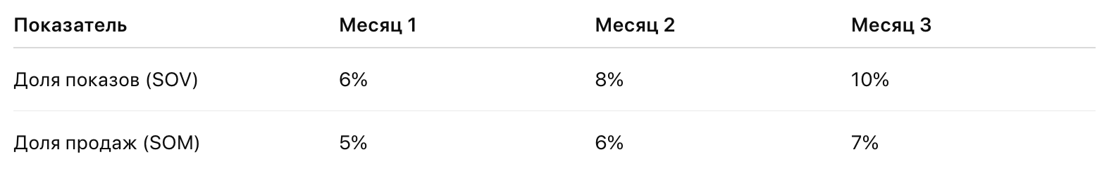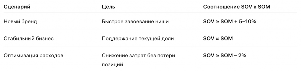 Π§ΡΠΎΠ±Ρ SOV = SOM, Π½ΡΠΆΠ½ΠΎ ΡΡΠ°ΡΠΈΡΡ 4% ΠΎΡ ΠΎΠ±ΡΠ΅Π³ΠΎ ΡΠ΅ΠΊΠ»Π°ΠΌΠ½ΠΎΠ³ΠΎ Π±ΡΠ΄ΠΆΠ΅ΡΠ° β 300 000 β½ Π² ΠΌΠ΅ΡΡΡ. Π§ΡΠΎΠ±Ρ SOV > SOM (+2%), Π½ΡΠΆΠ½ΠΎ ΠΏΡΠΈΠΌΠ΅ΡΠ½ΠΎ 400β450 ΡΡΡ. β½ Π² ΠΌΠ΅ΡΡΡ.