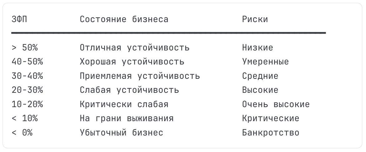 ЗФП (%) = ((Текущая выручка — Точка безубыточности) / Текущая выручка) × 100%
