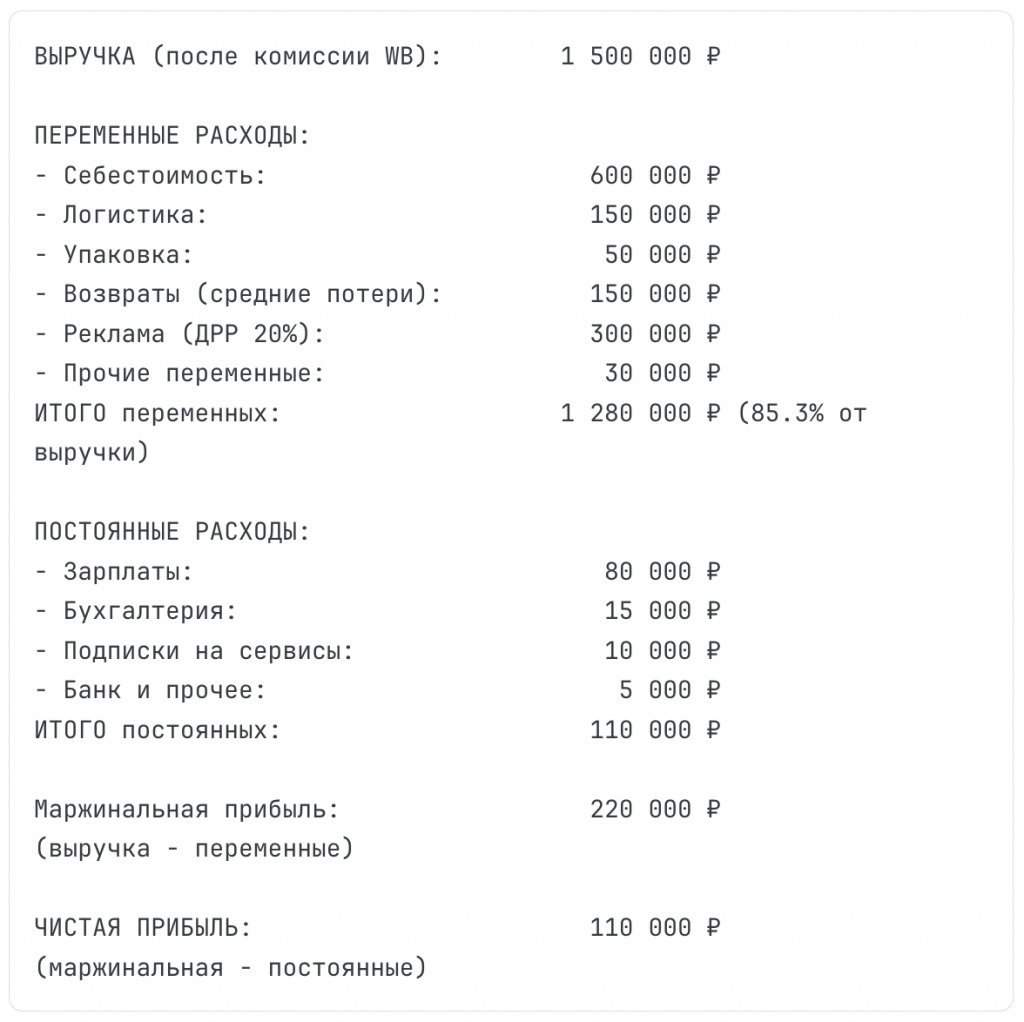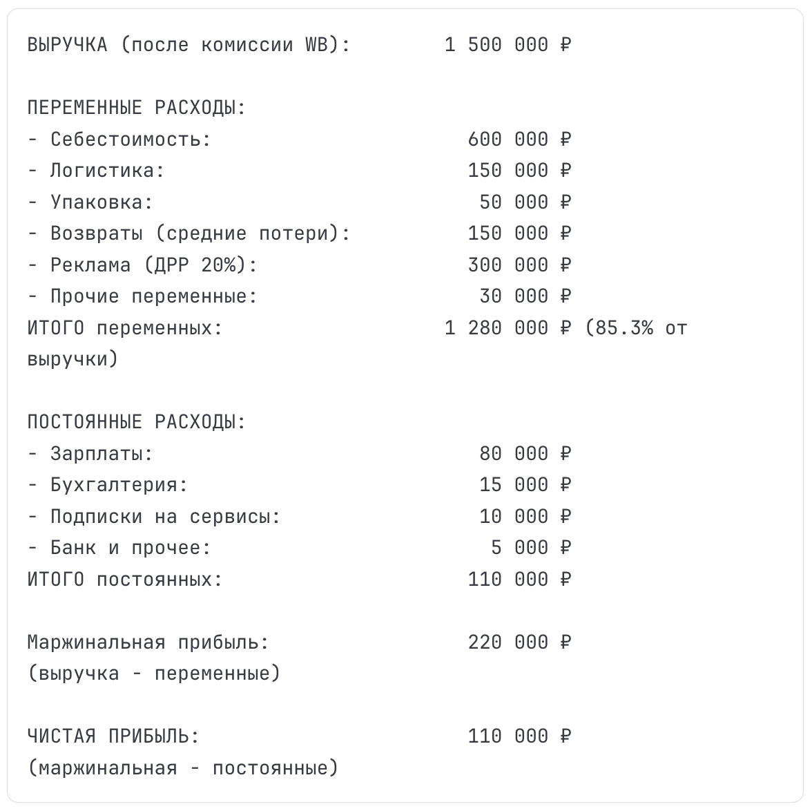 • Переменные расходы: 1 200 000 ₽/мес (60% от выручки)