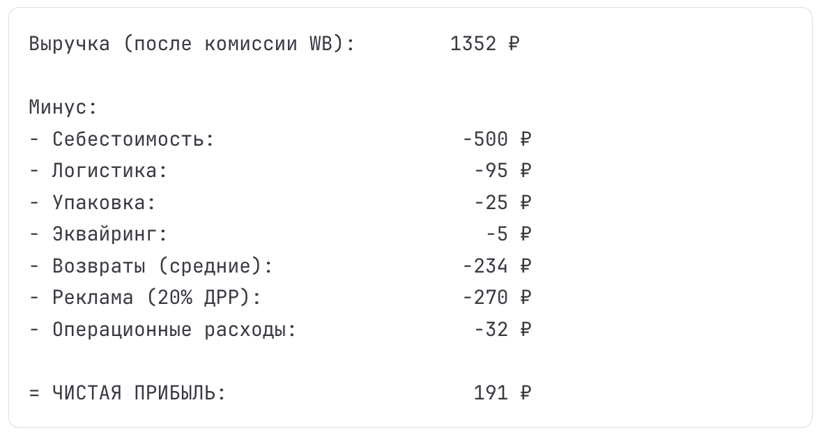 ✅ Шаг 2: Вычтите комиссию WB (обычно 15-25%)