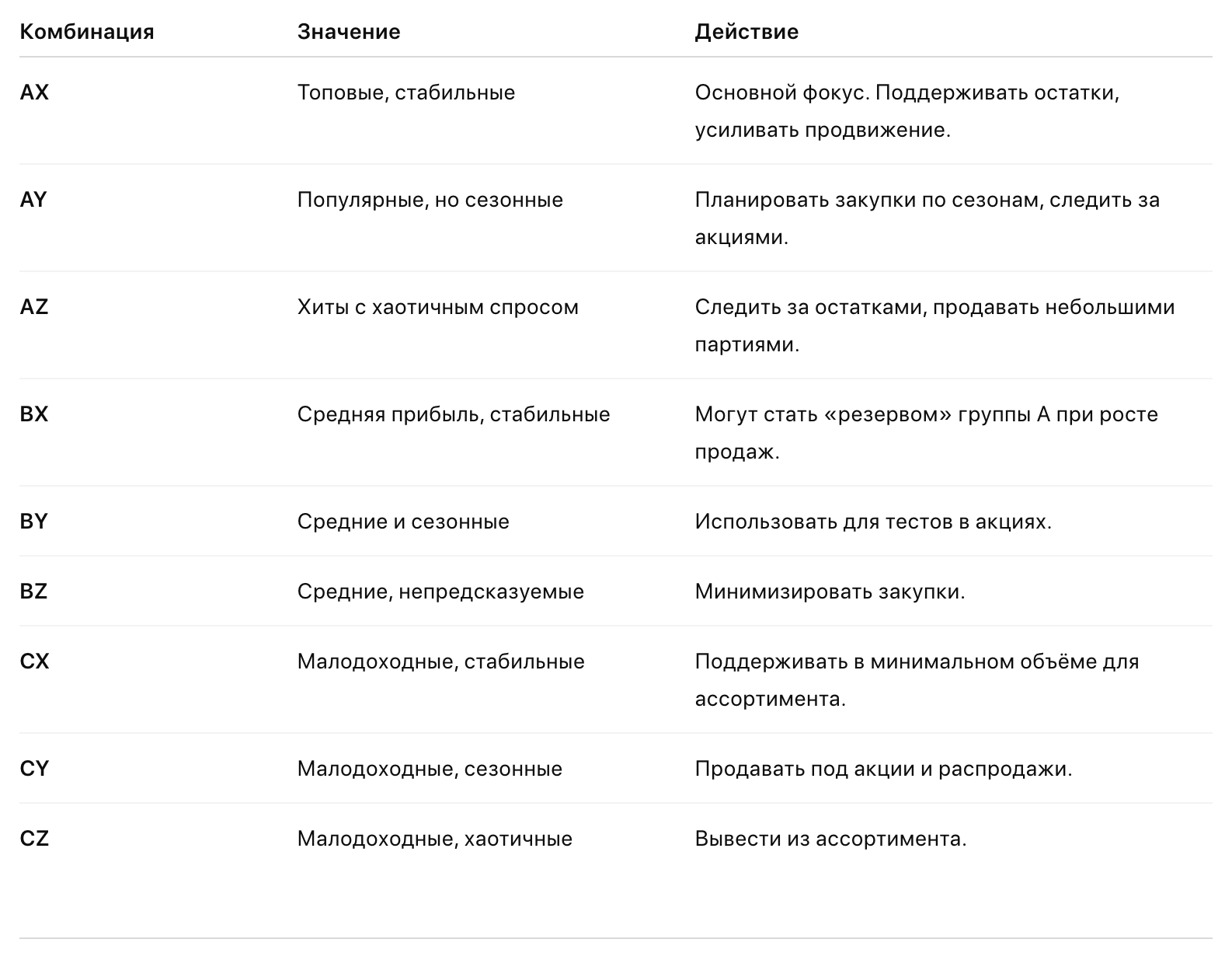 ABC–XYZ-Π°Π½Π°Π»ΠΈΠ· ΠΏΠΎΠΌΠΎΠ³Π°Π΅Ρ‚ ΠΏΠΎΠ½ΡΡ‚ΡŒ, Π³Π΄Π΅ ассортимСнт Ρ€Π°Π·Π΄ΡƒΡ‚ искусствСнно. УмСньшив количСство слабых SKU, Π²Ρ‹ снизитС расходы Π½Π° Ρ…Ρ€Π°Π½Π΅Π½ΠΈΠ΅, логистику ΠΈ ΠΌΠ°Ρ€ΠΊΠ΅Ρ‚ΠΈΠ½Π³.