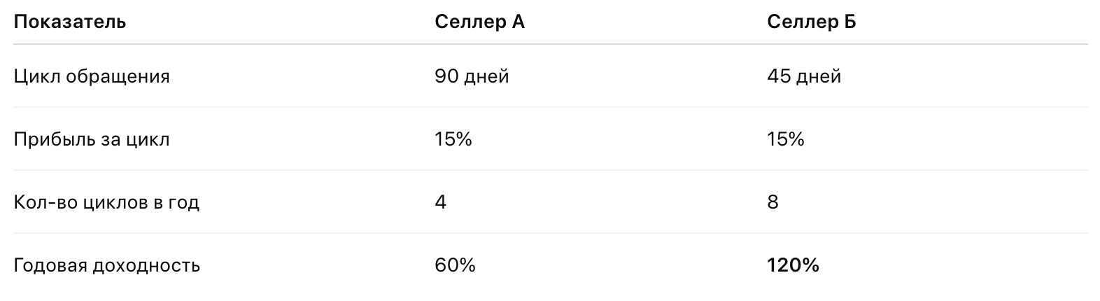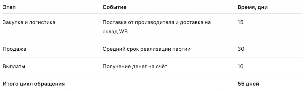 ΠŸΡ€ΠΎΡΡ‚ΠΎΠΉ ΠΏΡ€ΠΈΠΌΠ΅Ρ€: Π’Ρ‹ Π·Π°ΠΊΡƒΠΏΠΈΠ»ΠΈ Ρ‚ΠΎΠ²Π°Ρ€ 1 ΠΌΠ°Ρ€Ρ‚Π°, размСстили Π΅Π³ΠΎ Π½Π° складС 10 ΠΌΠ°Ρ€Ρ‚Π°, Π° ΠΏΠ΅Ρ€Π²ΡƒΡŽ Π²Ρ‹ΠΏΠ»Π°Ρ‚Ρƒ ΠΎΡ‚ WB ΠΏΠΎΠ»ΡƒΡ‡ΠΈΠ»ΠΈ 1 апрСля. Π’Π°Ρˆ Ρ†ΠΈΠΊΠ» обращСния составил 31 дСнь β€” это врСмя, Π·Π° ΠΊΠΎΡ‚ΠΎΡ€ΠΎΠ΅ дСньги сдСлали ΠΏΠΎΠ»Π½Ρ‹ΠΉ ΠΊΡ€ΡƒΠ³.