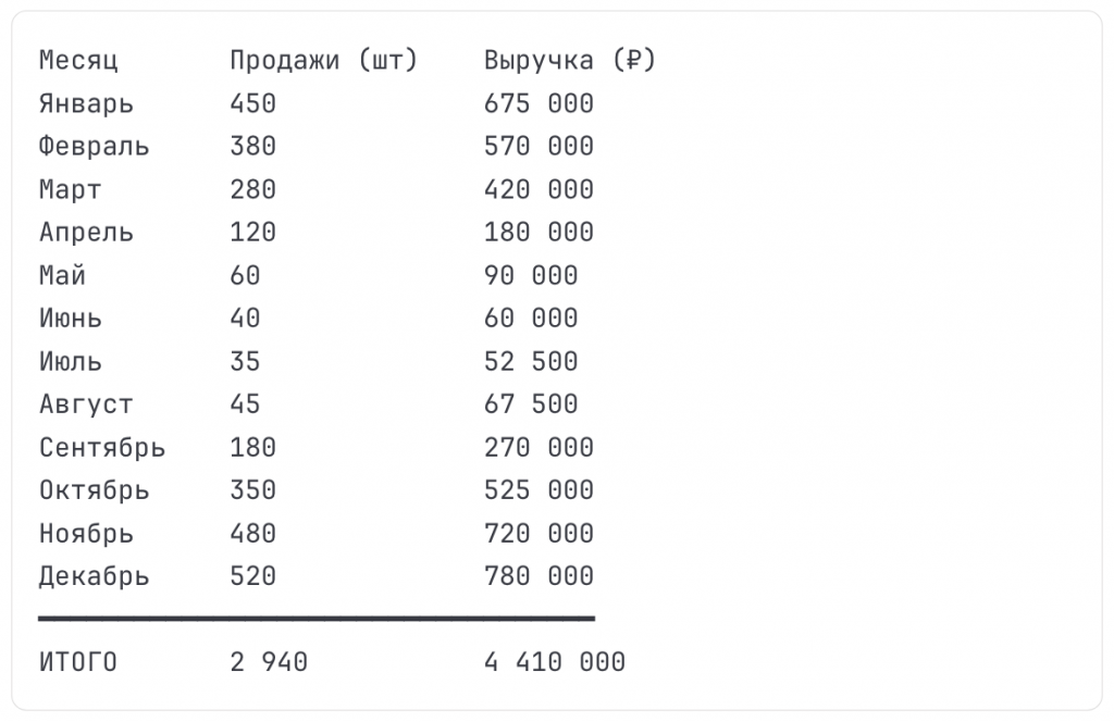 Средние продажи = 2 940 / 12 = 245 шт/мес