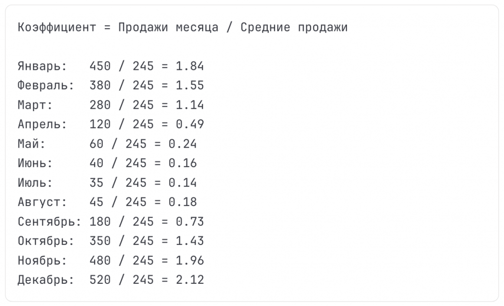 ✅ Шаг 2: Рассчитайте коэффициенты сезонности по месяцам (из своих данных или конкурентов)