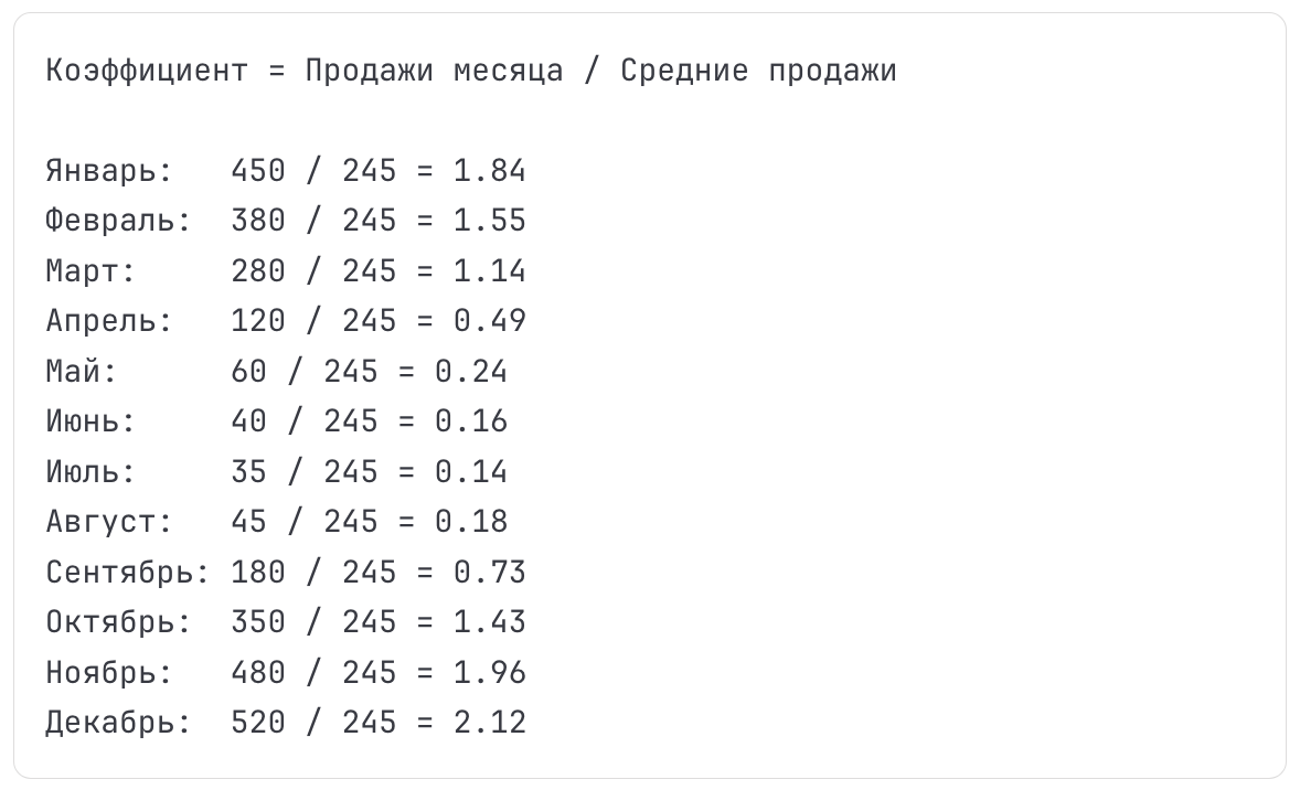 Решение: Планируйте по средним продажам, умноженным на коэффициент сезонности.