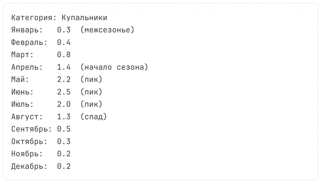 Реальная статистика: В сезонных категориях разница между пиком и межсезоньем достигает 5-10 раз. Если в июле продали купальников на 2 млн, в январе продадите на 200 тысяч.