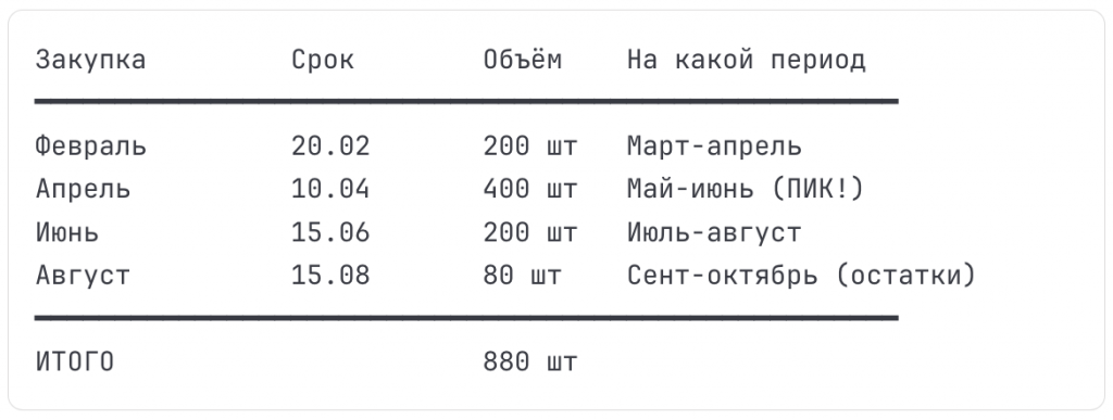 Рассчитали: в июне продадим 250 шт. Закупили ровно 250.