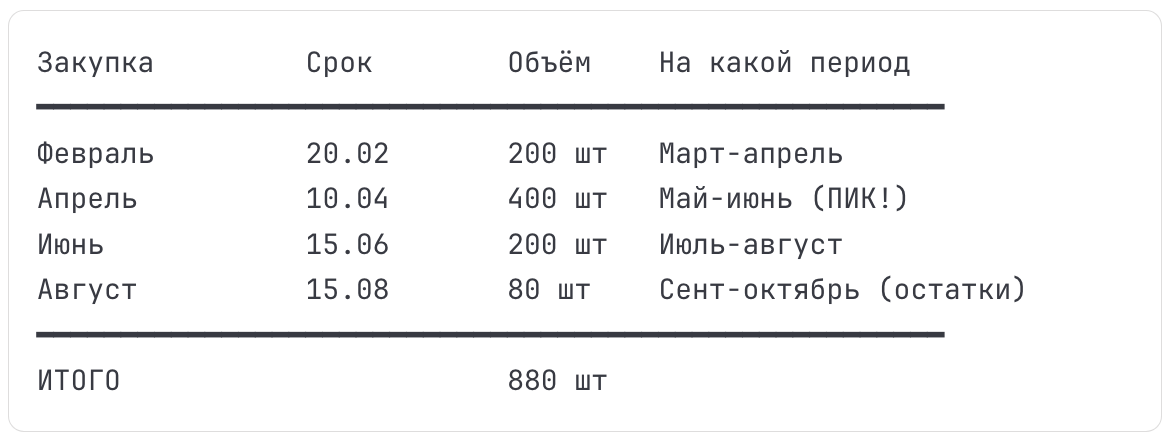 ✅ Шаг 6: Составьте график закупок (за 1-2 месяца до роста продаж)