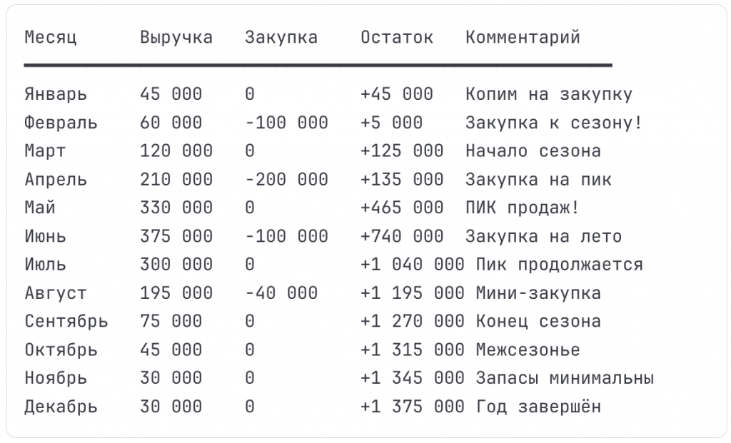 ✅ Накопление в межсезонье: Не тратьте всю прибыль осенью-зимой. Откладывайте на весеннюю закупку.
