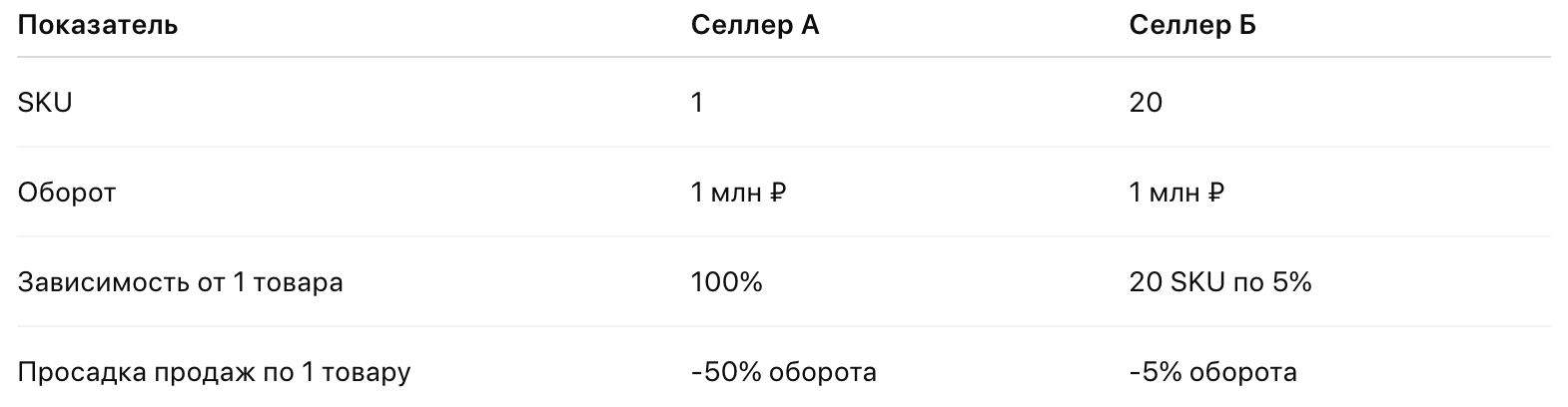 Если Ρƒ вас «всё завязано» Π½Π° ΠΎΠ΄Π½ΠΎΠΌ Ρ‚ΠΎΠ²Π°Ρ€Π΅, любая просадка Π² спросС, Π±Π»ΠΎΠΊΠΈΡ€ΠΎΠ²ΠΊΠ° ΠΊΠ°Ρ€Ρ‚ΠΎΡ‡ΠΊΠΈ ΠΈΠ»ΠΈ сбой поставок ΠΌΠΎΠΆΠ΅Ρ‚ ΠΎΠ±Ρ€ΡƒΡˆΠΈΡ‚ΡŒ ΠΎΠ±ΠΎΡ€ΠΎΡ‚ Π½Π° 70–90%. А Ссли ассортимСнт сбалансирован, Π²Ρ‹ спокойно ΠΏΡ€ΠΎΡ…ΠΎΠ΄ΠΈΡ‚Π΅ сСзонныС колСбания ΠΈ сохраняСтС Π΄Π΅Π½Π΅ΠΆΠ½Ρ‹ΠΉ ΠΏΠΎΡ‚ΠΎΠΊ.