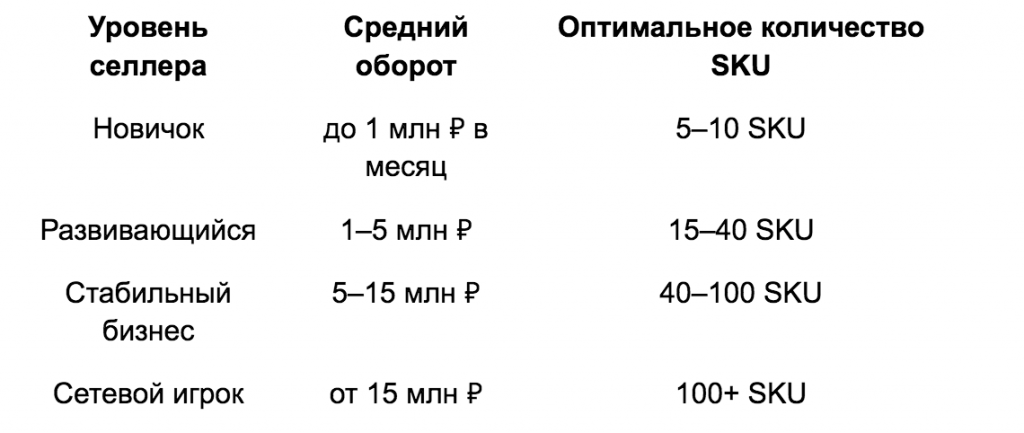 ΠžΠ΄Π½ΠΎΠ·Π½Π°Ρ‡Π½ΠΎΠ³ΠΎ ΠΎΡ‚Π²Π΅Ρ‚Π° Π½Π΅ сущСствуСт. ΠšΠΎΠ»ΠΈΡ‡Π΅ΡΡ‚Π²ΠΎ SKU зависит ΠΎΡ‚ вашСго ΠΎΠ±ΠΎΡ€ΠΎΡ‚Π°, ниши ΠΈ стратСгии. Но ΠΌΠΎΠΆΠ½ΠΎ Π²Ρ‹Π΄Π΅Π»ΠΈΡ‚ΡŒ нСсколько ΠΎΡ€ΠΈΠ΅Π½Ρ‚ΠΈΡ€ΠΎΠ², основанных Π½Π° Π°Π½Π°Π»ΠΈΡ‚ΠΈΠΊΠ΅ маркСтплСйсов.