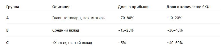 - ABC-анализ показывает, какие товары дают основную выручку и прибыль.