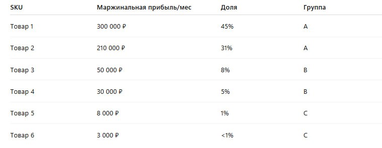 ABC-анализ разделяет SKU по вкладу в выручку или маржинальную прибыль. Важно: грамотные продавцы считают не оборот, а маржу в рублях.