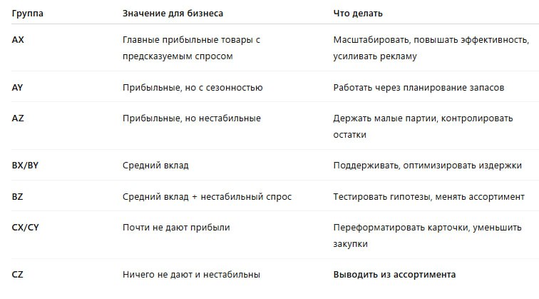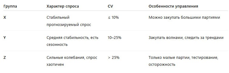 - XYZ-анализ показывает насколько стабилен спрос по каждому SKU.