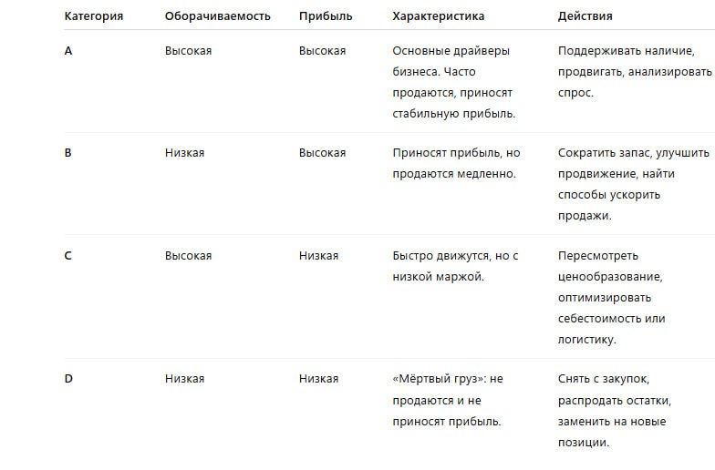 Такая матрица позволяет быстро определить, какие товары «работают» на бизнес, а какие — тормозят оборот.