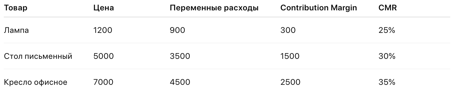 Если у вас несколько SKU, можно построить таблицу CMR по каждому товару, чтобы видеть, какие позиции приносят наибольший вклад в покрытие фиксированных расходов.