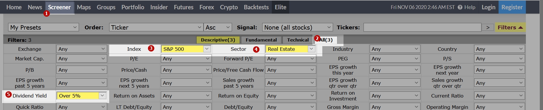 Чтобы найти интересные REIT фонды с максимальными выплатами дивидендов будем использовать сервис finviz.com. В сервисе Finviz переходим во вкладку “Screener”, далее во вкладку “ALL”, потом в опции “Sector” (там выбираем раздел Real Estate). Также поставим фильтр Index → S&P500 (выбрать те фонды, которые входят в индекс S&P500). Это позволит исключить не привлекательные для инвестиционных фондов REIT и фонды малой капитализации. Также устанавливаем фильтр на размер годовых дивидендов (Dividend Yield) > 5%.