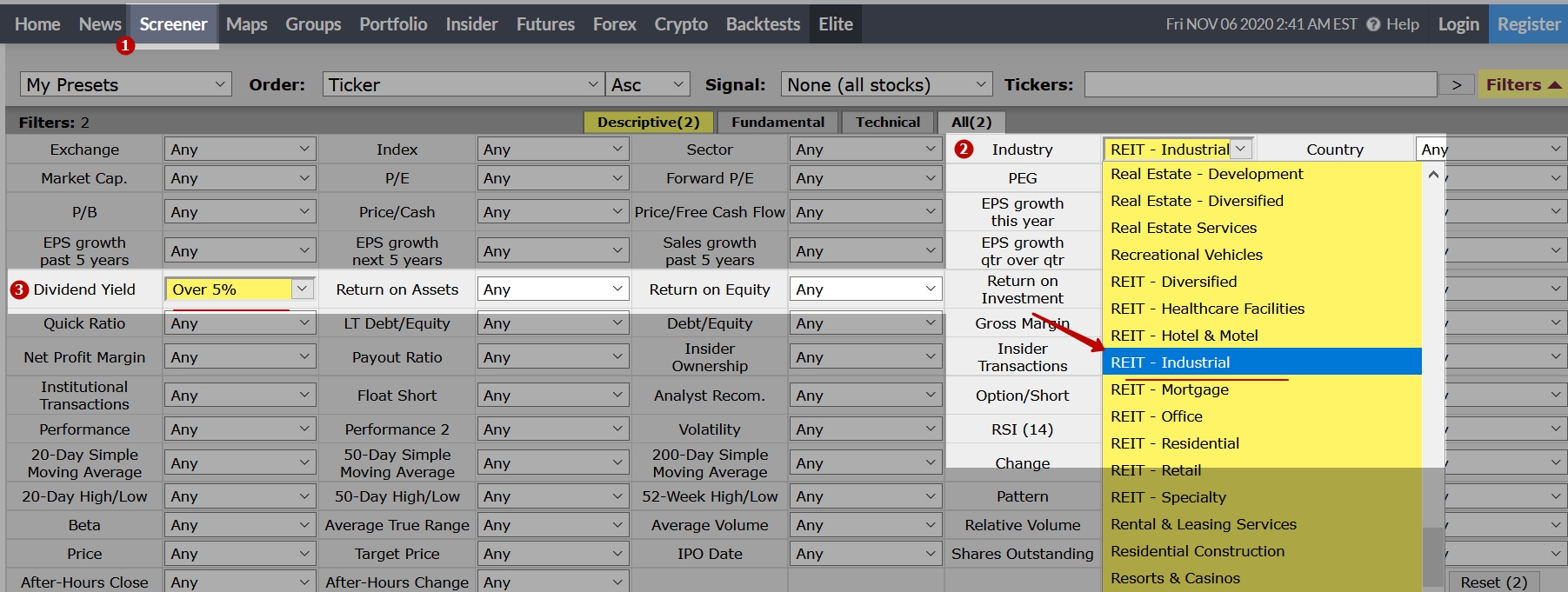 Если мы хотим сузить поиск дивидендных фондов REIT до их специализации, то в вкладке Industry выбираем: Diversified – без четкой специализации (широко диверсифицированные), Healthcare Facilities – управление недвижимостью больниц, лабораторий, мед. компаний, Mortgage – доход от ипотечных платежей, Office – управление недвижимостью офисов, Residential — апартаменты для сдачи в аренду и временного проживания, Retail – недвижимость торговых компаний, Specialty – кинотеатры, театры, казино.
