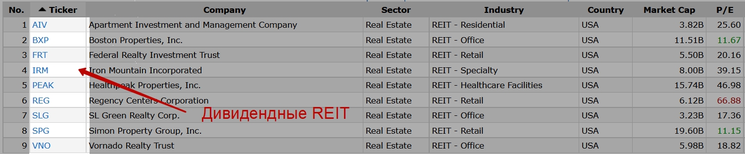 В таблице ниже итоговые результаты поиска крупных REIT фондов из индекса S&P500 и их дивидендная доходность. Максимальная у фонда IRM – 8,99%, но он достаточно перегрет на рынке. Мультипликатор P/E составляет 39! Интересным фондом является SPG с доходность 8,19%, крупной капитализацией и недооцененностью, коэффициент P/E равен 11,15. (см. → мультипликатор P/E. Применение)