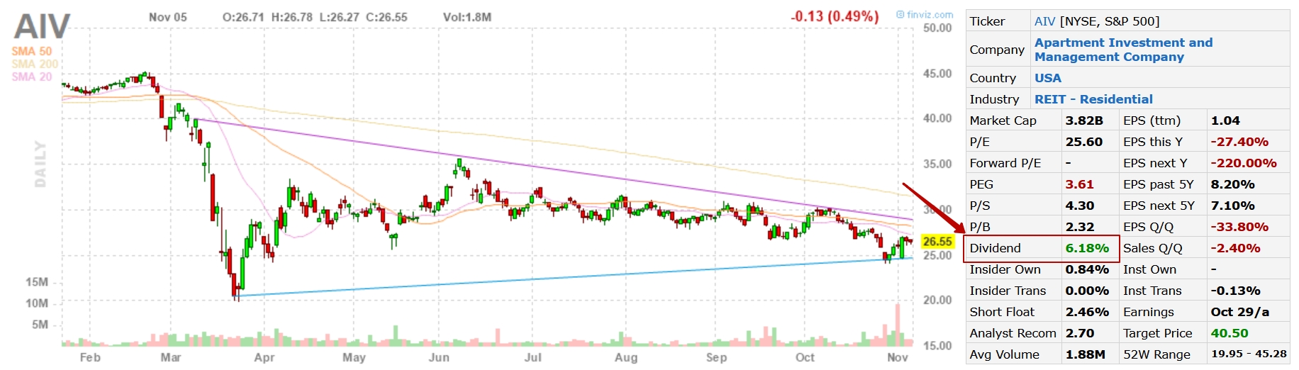 | AIV | Apartment Investment and Management Company | Апартаменты | 3.82 млрд. | 25.60 | 6,18% |