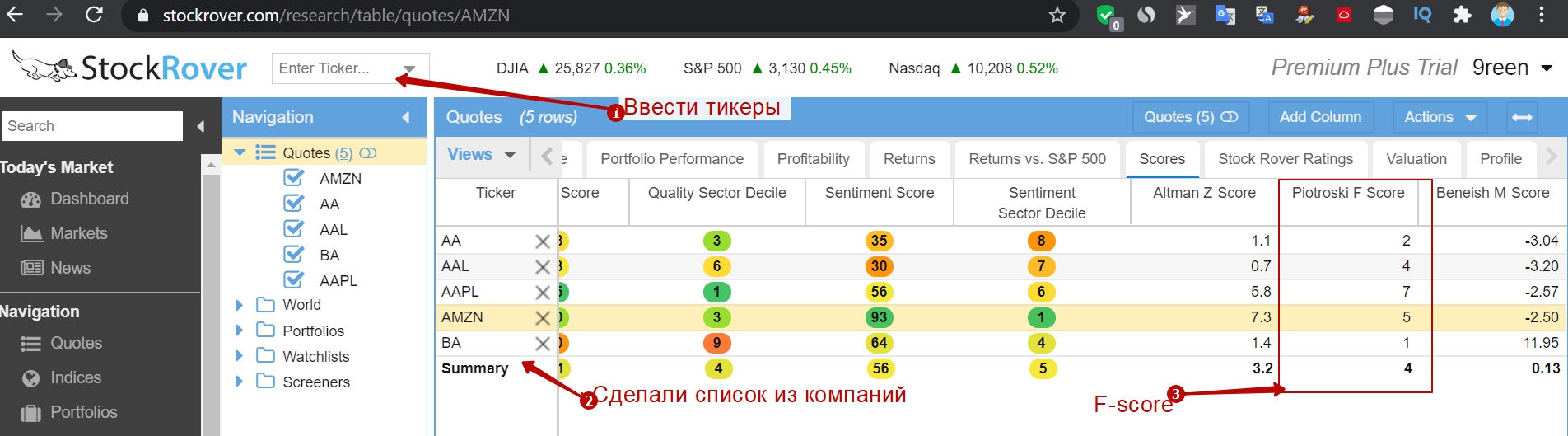 Для расчета и сравнения F-score можно воспользоваться сервисами: stockrover.com, gurufocus.com. Для первого сервиса мы выделили компании (АА, AAL, AAPL, AMZN, BA) для сравнения по этому показателю. Так самый большой показатель был у компании Apple (AAPL) – 7. Самый низкий у Boeing – 1.