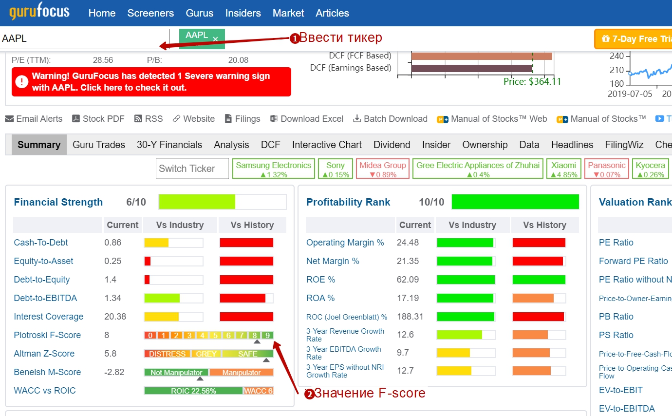 Для сервиса gurufocus.com значение F-score находится в разделе Screeners – вкладка Summary. Для компании Apple значение F-score в этом сервисе равно 8.