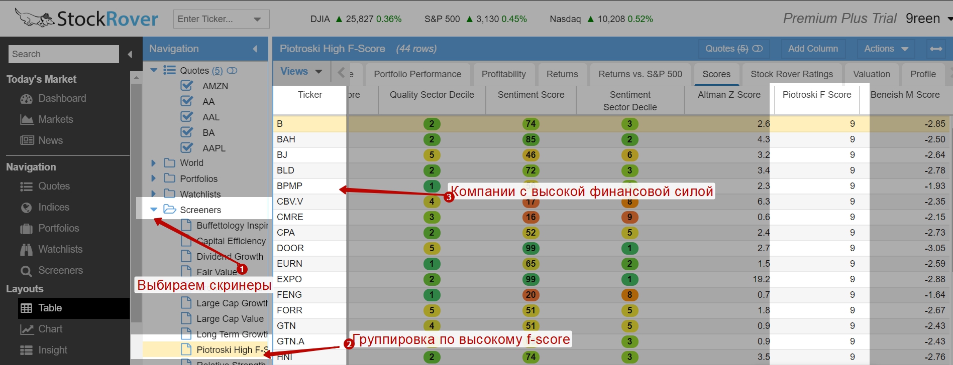 Также удобно сразу находить список компаний, у которых высокая финансовая сила. Для этого в сервисе srockrover.com в панели навигации нам нужно выбрать папку Screeners, затем группировку по самому высокому F-score. Как видно на рисунке у всех компаний F-score равен 9.