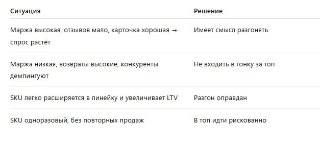 Если после выхода в топ SKU не приносит прибыли даже без рекламы — карточку нужно снимать или перепозиционировать.