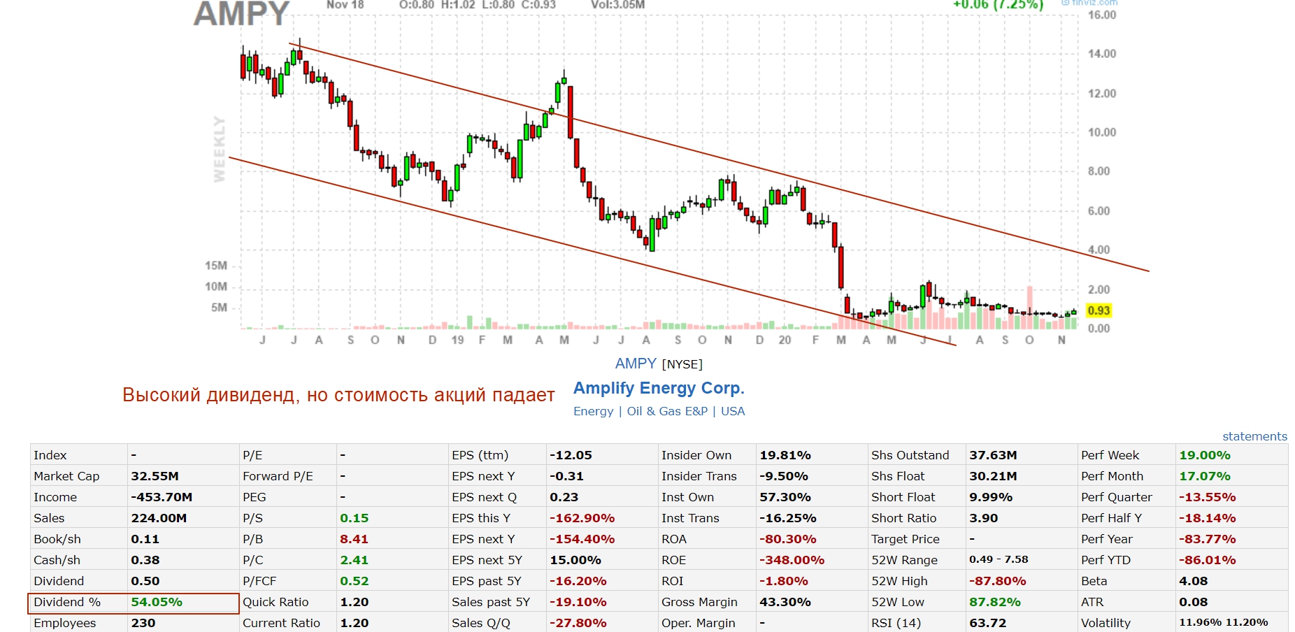 К примеру, компания из нефтяной индустрии США AMPY с 2018 года снизилась с 14$ до 0,93$, несмотря на высокие дивиденды в 54% нет смысла в нее вкладывать, так как стоимость снижается намного быстрее.