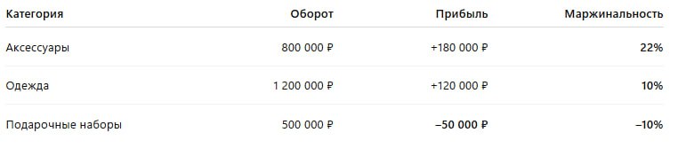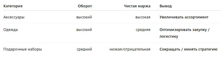 И если какая-то категория стабильно показывает отрицательную маржинальность — это не просто “неудачный товар”, это финансовый риск, который нужно контролировать и устранять.