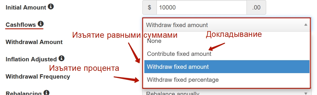 Сейчас рассмотрим, когда мы будем изымать часть капитала из дивидендного портфеля на собственные нужды и траты. Также есть опция докладывания в портфель. С ее помощью можно будет оценить какой станет инвестиционный портфель если мы будем дополнительно вливать капитал.