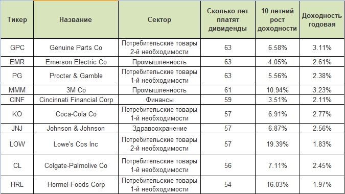 Возьмем акции дивидендных аристократов с максимальными доходностями. Каждая акция будет занимать одинаковую долю в 10%.