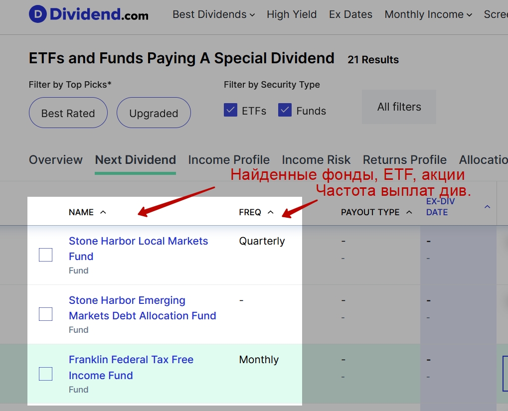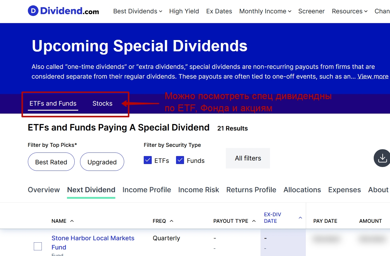 Ниже будет показана фонды, ETF, акции, платящие дополнительные дивиденды. Чтобы посмотреть дату выплат необходимо купить платную версию сервиса.