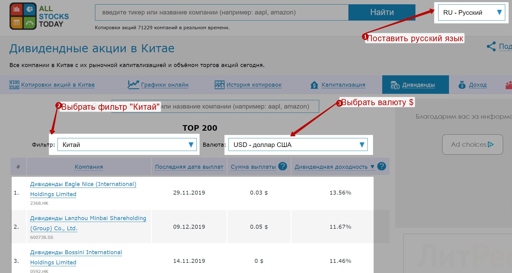 Для поиска китайских акций воспользуемся сайтом allstockstoday.com (есть хорошая русская версия). Для этого выбираем раздел Dividends на главной странице.