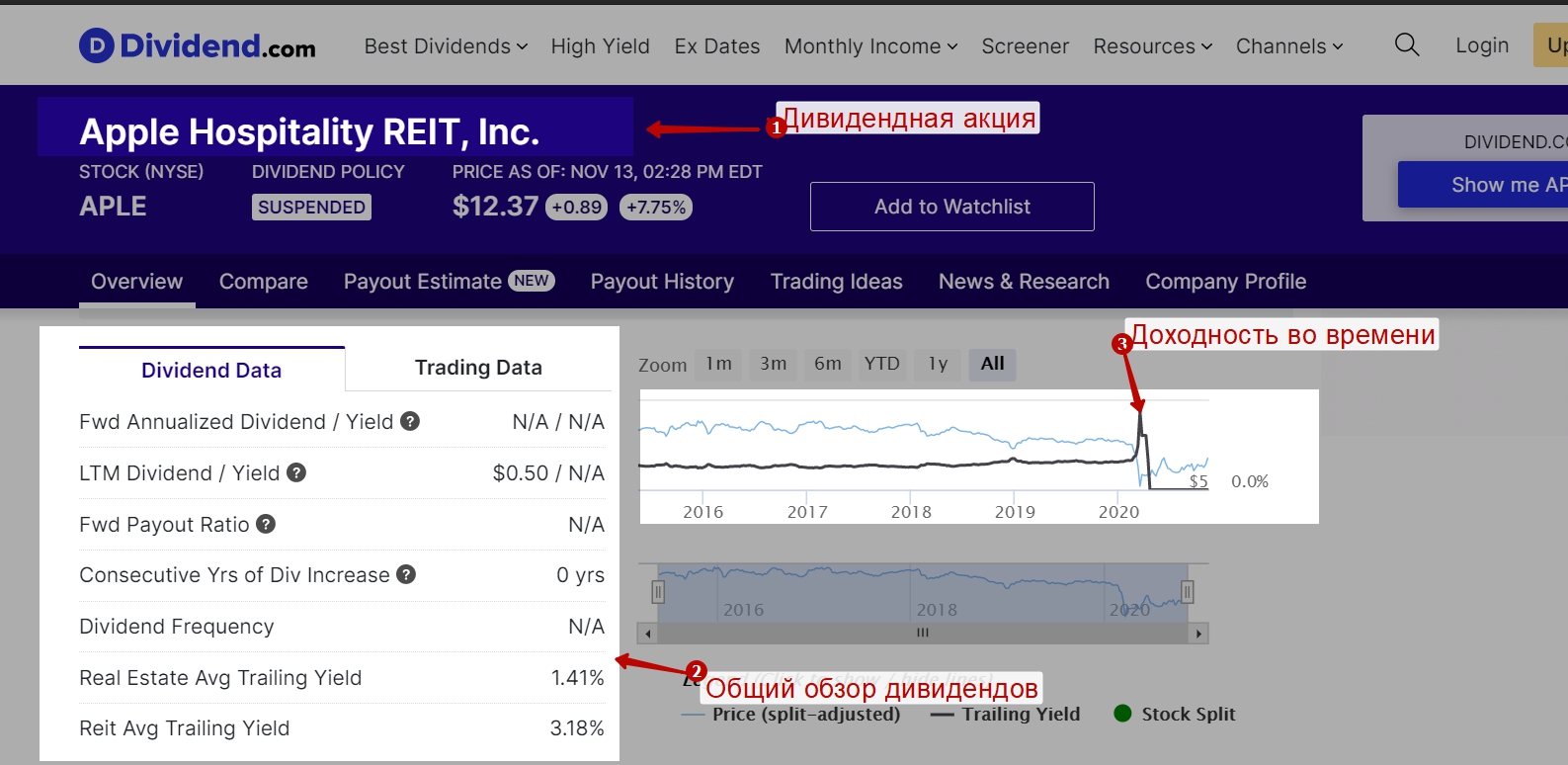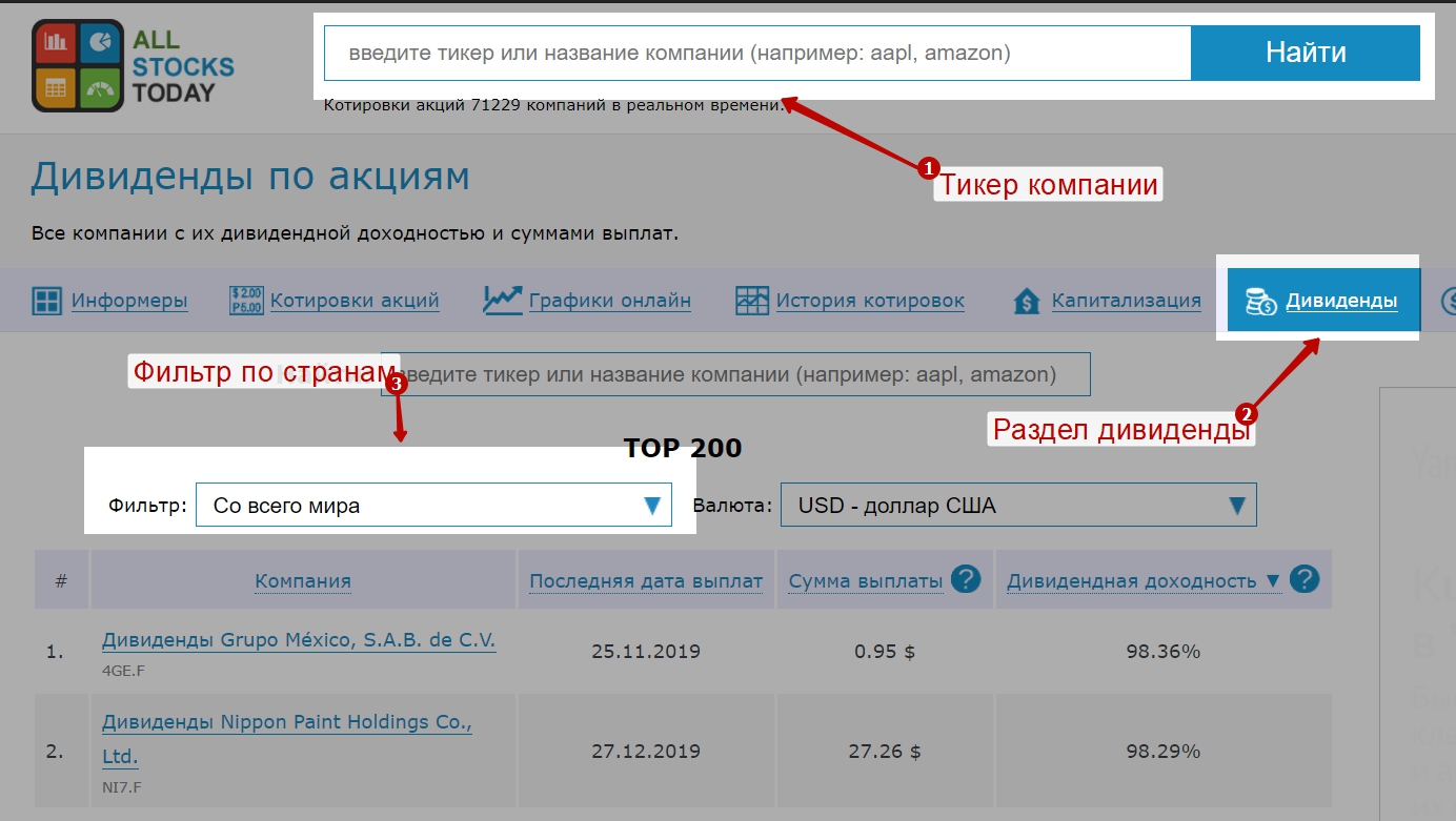 Следующий сервис для оценки дивидендов практически всех стран очень простой в использовании. Сайт дивидендного скринера — allstockstoday.com/dividends.html. Помимо этого, в нем есть отличная локализация на русский язык. Все понятно и просто. Вводим тикер компании и получаем дивидендную историю платежей и дату следующего платежа. Также можно фильтровать компании по странам.
