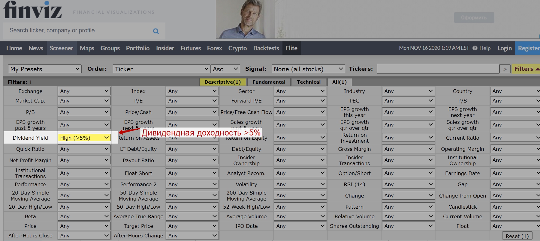 Finviz.com фильтр по дивидендам и финансовым показателям