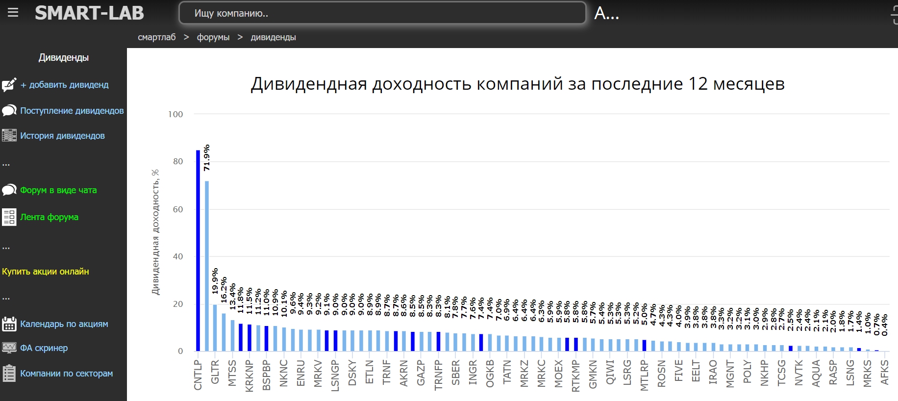 Рассмотрим еще один скринер, в котором есть анализ дивидендной доходности компаний. Сайт дивидендного скринера smart-lab.ru/dividends. Удобное графическое представление дивидендной доходности у компаний за последние 12 месяцев. В сводной таблице можно посмотреть дивидендную доходность, дивиденды в рублях, дату отсечки и дату выплаты. Помимо того, есть рекомендация до какой даты необходимо купить, чтобы попасть в реестр.