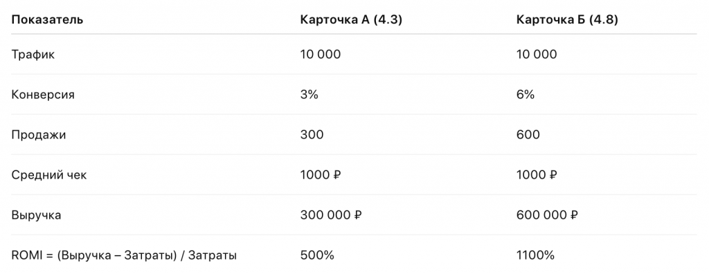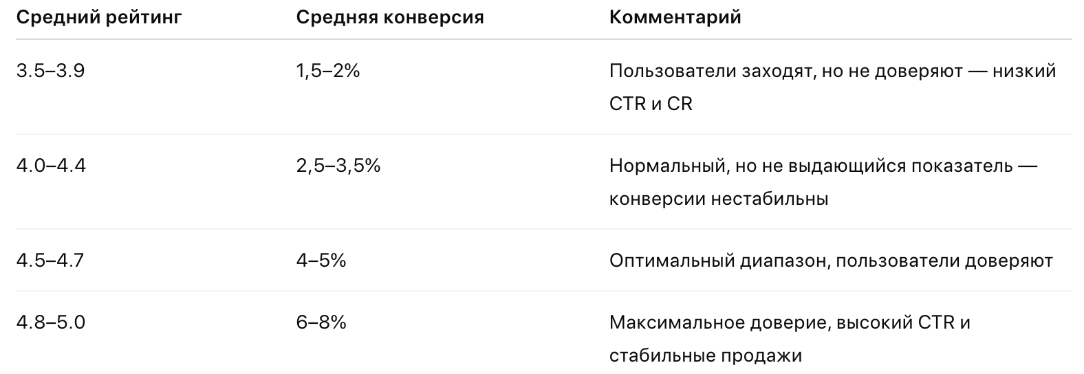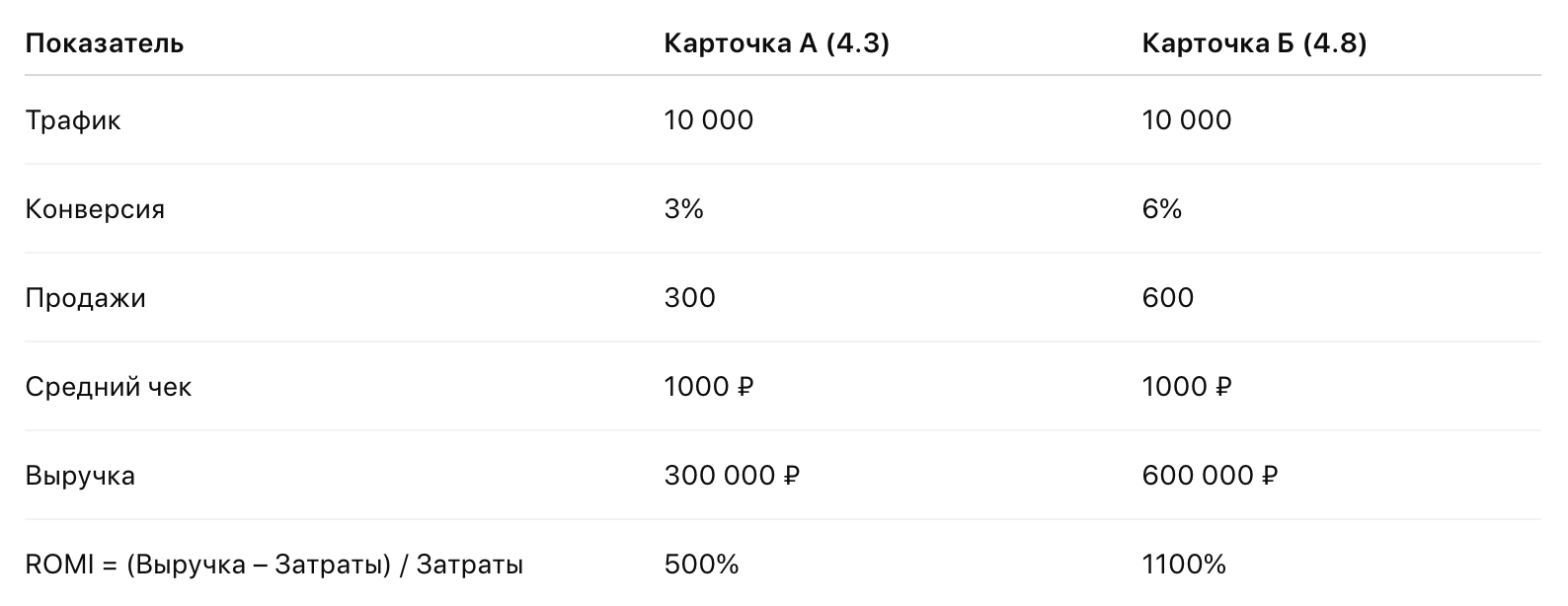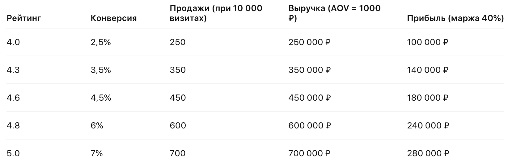 - При рейтинге 4.2 карточку товара посещают 1000 человек, конверсия 3%, выручка при среднем чеке 1000 ₽ = 30 000 ₽.