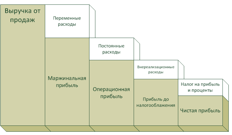 Маржинальная прибыль показывает эффективность реализации продукции (см. → маржинальная прибыль. Формула. Пример расчета). Операционная прибыль отражает результативность основного вида деятельности компании. Прибыль до налогообложения показывает эффективность за вычетом дополнительных затрат (штрафы, неустойки, расходы на обслуживание ценных бумаг и т.д.). Чистая прибыль – итоговый финансовый результат деятельности компании после вычета всех затрат, издержек, налогов и взносов (см. → чистая прибыль простыми словами. Формула. Методы анализа). На схеме ниже показана взаимосвязь всех видов прибылей и выручки.