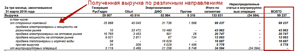 В консолидированной отчетности выручка расписывается по направлениям получения прибыли. Это позволяет выделить те виды деятельности, которые являются доминирующими в формировании выручки предприятия. К тому же выручка здесь формируется не только самой компанией РусГидро, но также и за счет сбыта и продажи другим электрокомпаниям Дальневосточного федерального округа (ДФО).