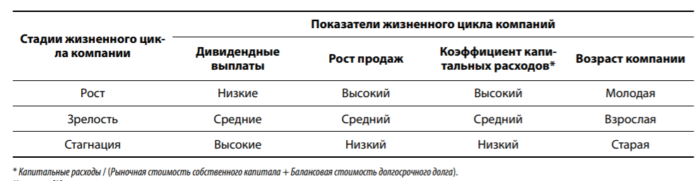Связь стадии жизненного цикла компании и показателей жизненного цикла представлены в таблице. Можно отметить, что в период роста компания платит низкие дивиденды, в период зрелости – средние и когда она начинает стагнировать – высокие дивиденды.